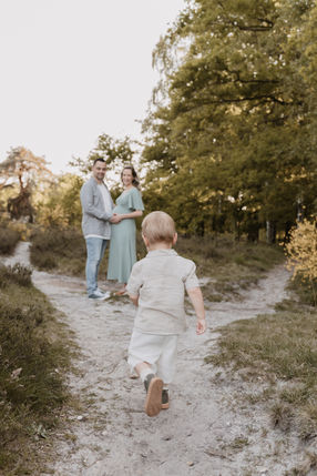 Het gouden uur viel een beetje laat voor Zef. Daarom spraken we af op een eerder tijdstip waarop Zef nog vrolijk en fit was. We zochten de schaduw op aan de kant van het bezoekerscentrum van de Brunssumerheide. Daar staat meer bomen dan aan de andere kant bij de Rode Beek. Ik had een wit dekentje meegenomen zodat dit lieve gezinnetje even in het zand kon zitten. Zef liet trots een klein rupsje op zijn arm lopen.
